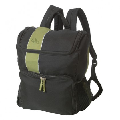 Black fabric made from 100% recycled material with a zippered main compartment and adjustable shoulder strap.